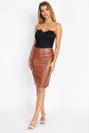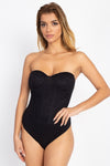 A knit tube bodysuit featuring a floral lace bodice, a sweetheart neckline with eyelash trim, underwire, a back zip-up closure, and snap-button bottom closures
