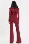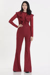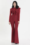 GLITTERED STRETCH CREPE SOLID / MESH AND RUFFLE DETAILED / ROUND NECK / LONG SLEEVE / BELL BOTTOM / ZIPPER BACK