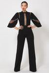 Semi Sheer Mesh Contrast Bodice Jumpsuit Mock Neck, Half Sleeve Frontline Flared Leg Design Zipper on the Back