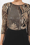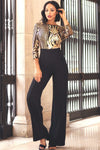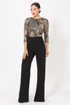 Open Back Gold Sequin Pattern Jumpsuit Round Neck, ¾ Sleeve, Zipper on Back Frontline Flared Leg Design