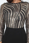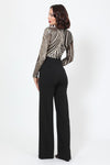 Sophisticated Gold Sequins Bodice Jumpsuit Round Neck, Long Sleeves Front-line Flared Leg Design