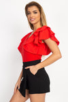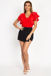 A woven ribbed shirt in a solid color, featuring a v-neckline, ruffle tiered short sleeves, and a waist length.