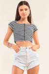 Black and grey, horizontal stripe pattern, soft square neckline, mini sleeve, center front zipper fly closure, cropped length, tight fitting, semi-stretch, lined, casual, club wear, spring/summer wear