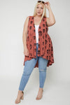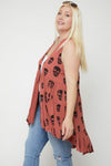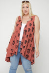 Sleeveless cardigan featuring a long flattering silhouette, a rounded pleated hemline, and a skull sublimation print.