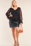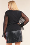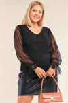 Plus Size Relaxed Fit Deep Plunge V-neck Long Polka Dot Mesh Balloon Sleeve Top