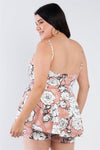 spaghetti strap, black, white, v-neck, floral print, wrap skirt, very stretchy, unlined romper