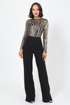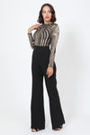 Sophisticated Gold Sequins Bodice Jumpsuit Round Neck, Long Sleeves Front-line Flared Leg Design